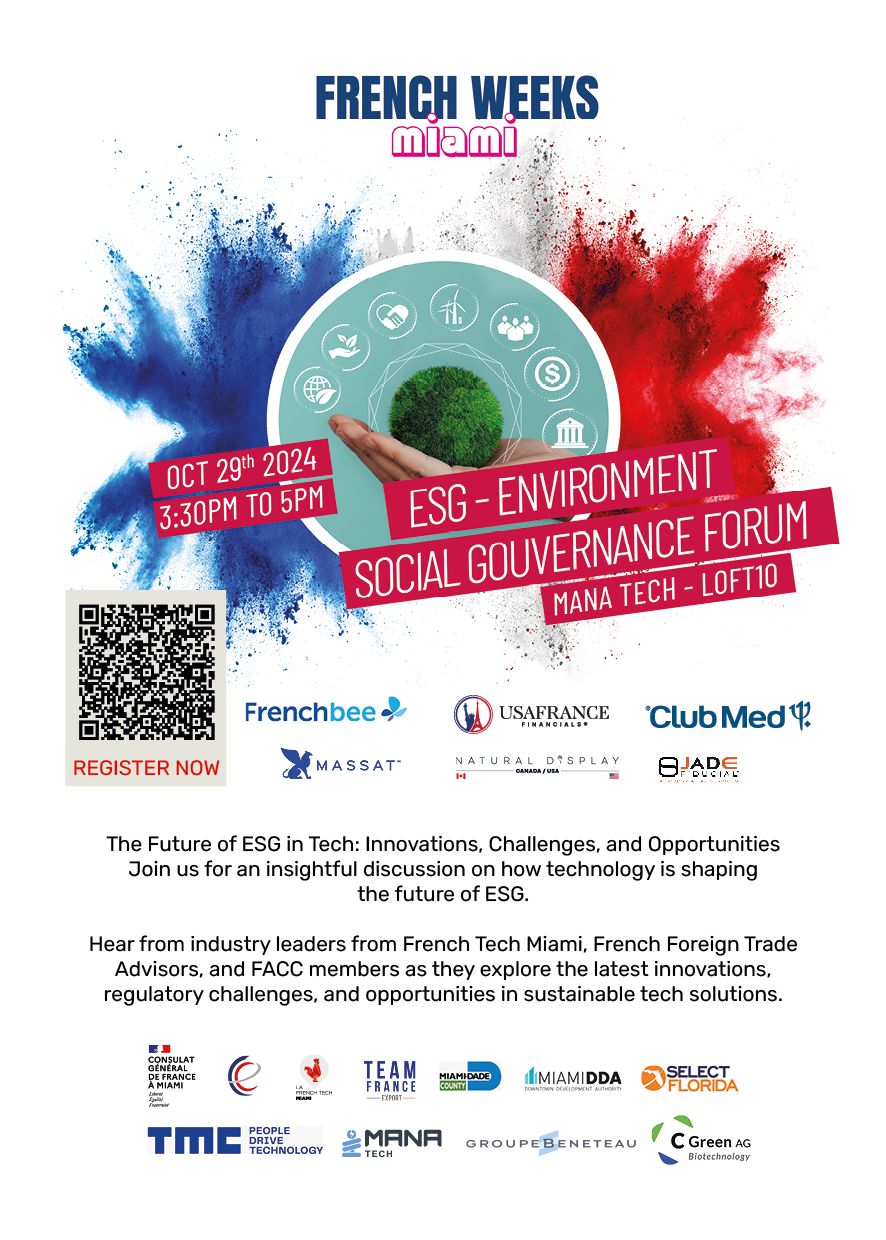 Hear from industry leaders from French Tech Miami, French Foreign Trade Advisors, and FACC members as they explore the latest innovations, regulatory challenges, and opportunities in sustainable tech solutions.