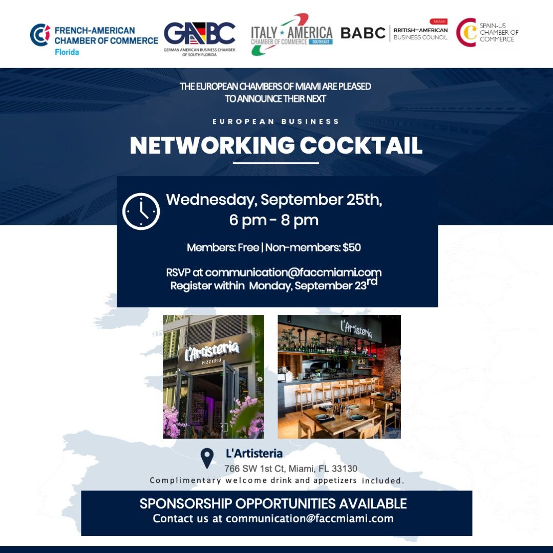 Join us at the European Chambers Networking Cocktail ???? at L’Artisteria Pizzeria in Brickell Save the Date ?? ? Wednesday, September 25th