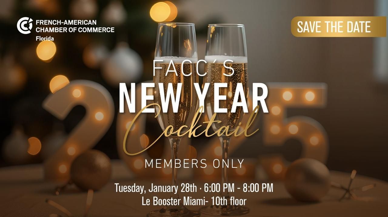 Join us for our New Year Cocktail and General Members Assembly on Thursday, January 28th, 2024, from 6 PM to 8 PM ! Let's reunite and start 2025, meet FACC Florida newest members, discover the 2025 Calendar of events, FACC new programs and services and celebrate the new year together.