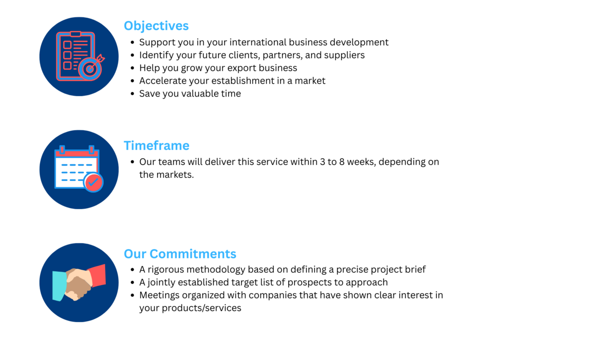 Based on a detailed project brief, our project managers will organize a business meeting schedule that will enable you to identify your future clients or partners in just a few weeks.