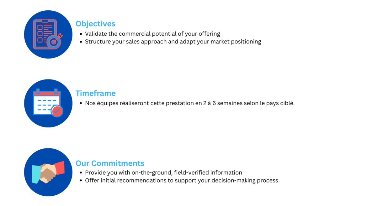 The market diagnostic is a preliminary study designed to help prepare your prospecting mission. This streamlined version of a full market study includes a list of key stakeholders (main importers, distributors, potential clients, and competitors) you are likely to engage with during the implementation of your project.