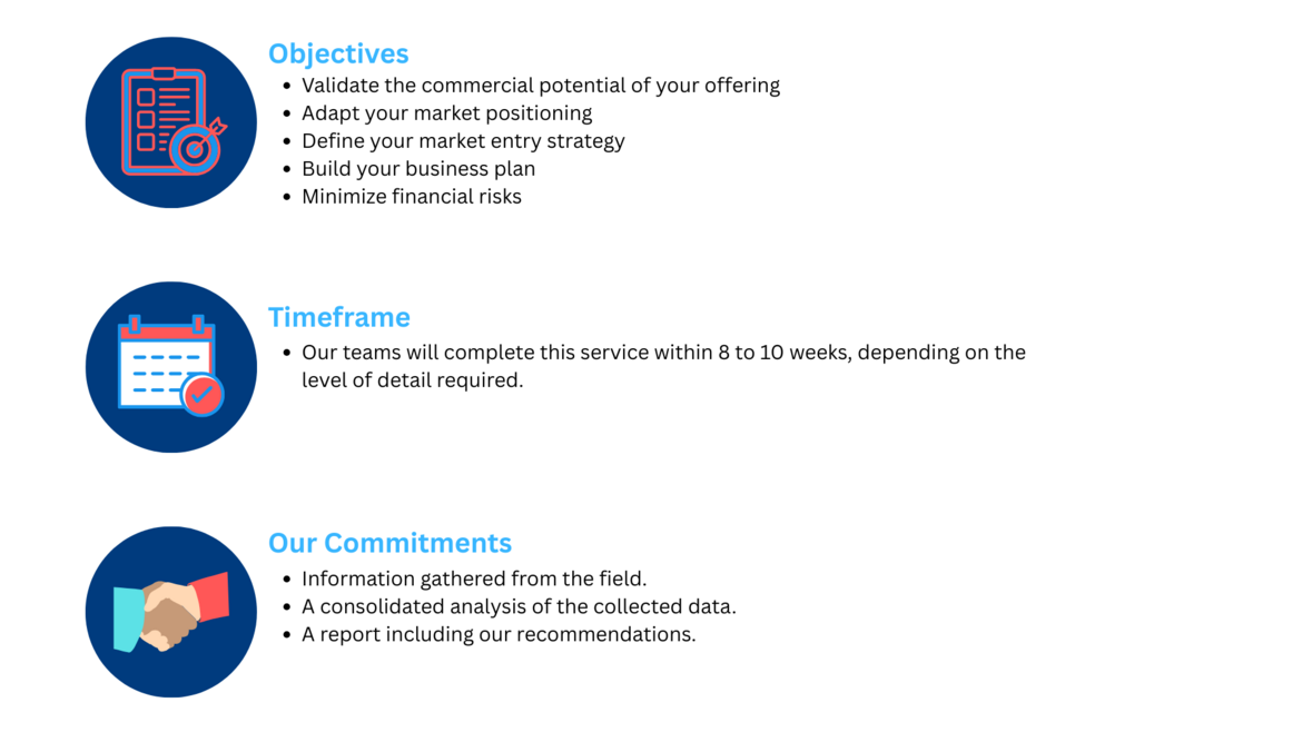 The results of the market study will allow you to assess your business potential and define your strategic direction, with a view to future market entry or the development of your commercial activities.
