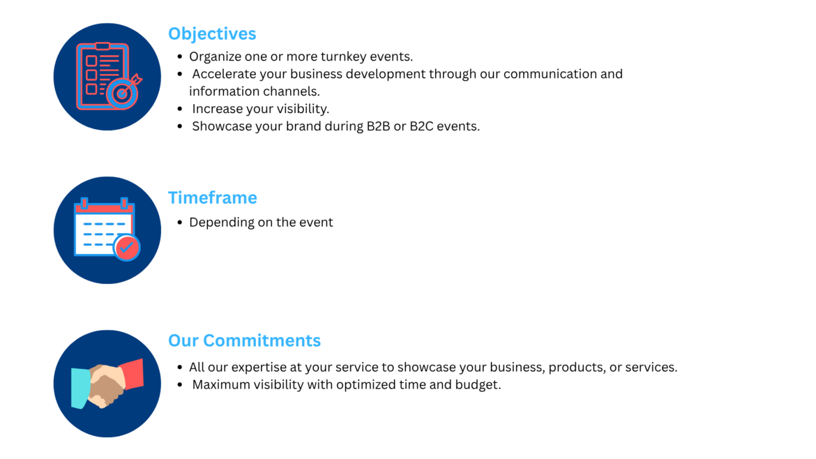 Logistics management: venue, catering, hostesses, video/sound/lighting technicians, event facilitation, translation services.